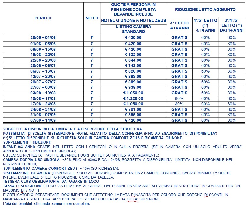 DESCRIZIONE E SERVIZI: è composta da un nuovissimo ed elegante Hotel “ZEUS” di 104 camere su tre piani e dall’Hotel “GIUNONE“ con 44 camere. CAMERE: eleganti e molto confortevoli; tutte dispongono asciugacapelli, telefono, TV, cassaforte, minifrigo non attrezzato. Si dividono in: ZEUS: Camere Standard, doppie, triple, quadruple (4° letto a castello) distribuite tra piano terra, primo piano e piano mansardato (assegnazione a discrezione della Direzione in base alla disponibilità). Servizi con vasca nelle camere del piano terra e primo piano, box doccia nelle camere dell'ultimo piano. Camere Comfort (doppie, triple, quadruple e quintuple), molto confortevoli, di dimensioni doppie rispetto alle camere standard e dotate di balcone. Al piano terra e primo piano sono quadruple con possibilità di 5° letto su richiesta, bagno con doccia idromassaggio. All’ultimo piano sono doppie/triple con bagno con vasca idromassaggio. Camere Comunicanti (su richiesta) ubicate in mansarda e costituite da 2 camere comunicanti con 2 servizi (occupazione 4/6 persone). Per le camere comunicanti viene richiesto pagamento minimo 4 quote intere + eventuale 5°/6°letto (su richiesta) con riduzioni da tabella. GIUNONE: Camere Standard, (doppie, triple, quadruple con 4° letto a castello), dotate di servizi privati con box doccia. Bicamere (triple, quadruple e quintuple) costituite da 2 camere con unico servizio con box doccia, atte ad ospitare su richiesta fino a 5 persone. Le camere del piano terra e primo di entrambi gli Hotel dispongono di poggiolo. Le mansardate hanno il finestrone. Le Comunicanti/Zeus e le Bicamere/Giunone sono ideali per nuclei familiari o di amici. Per finire, in entrambi gli hotel, camere standard a 2 letti a norma CEE adatti anche a persone diversamente abili.