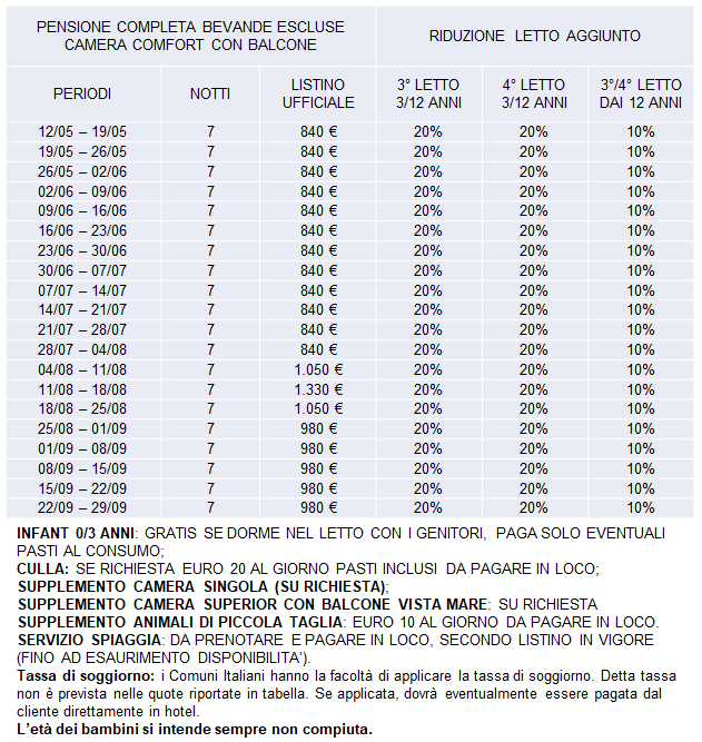 Le tariffe non comprendono eventuali promozioni da verificare al momento della prenotazione. Le tariffe riportate potrebbero non comprendere polizze assicurative integrative, adeguamento carburante (ove i trasferimenti fossero inclusi), eventuali tessere iscrizione, tasse, pulizie, consumi, ecc.; in tal senso è possibile richiedere accesso a listino dettagliato via mail, scrivendo a: numerouno@