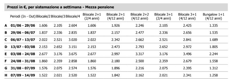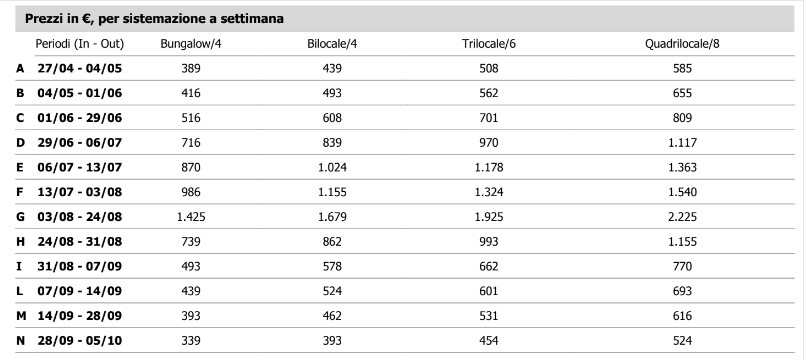 Le tariffe non comprendono eventuali promozioni da verificare al momento della prenotazione. Le tariffe riportate potrebbero non comprendere polizze assicurative integrative, adeguamento carburante (ove i trasferimenti fossero inclusi), eventuali tessere iscrizione, tasse, pulizie, consumi, ecc.; in tal senso è possibile richiedere accesso a listino dettagliato via mail, scrivendo a: numerouno@