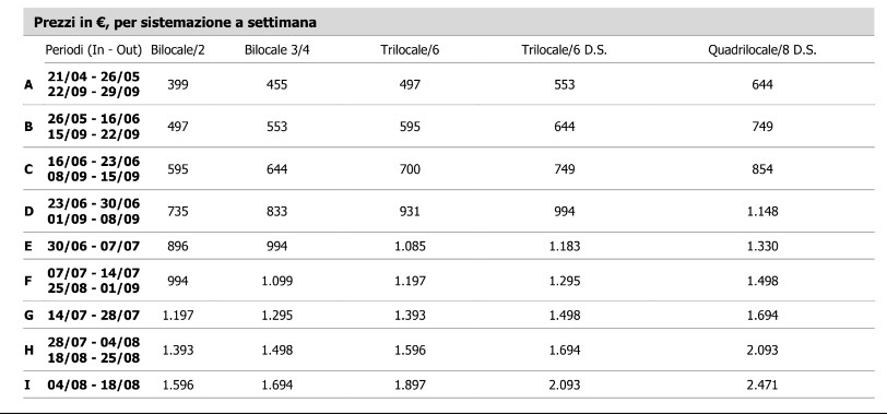 Le tariffe non comprendono eventuali promozioni da verificare al momento della prenotazione. Le tariffe riportate potrebbero non comprendere polizze assicurative integrative, adeguamento carburante (ove i trasferimenti fossero inclusi), eventuali tessere iscrizione, tasse, pulizie, consumi, ecc.; in tal senso è possibile richiedere accesso a listino dettagliato via mail, scrivendo a: numerouno@