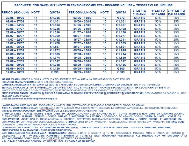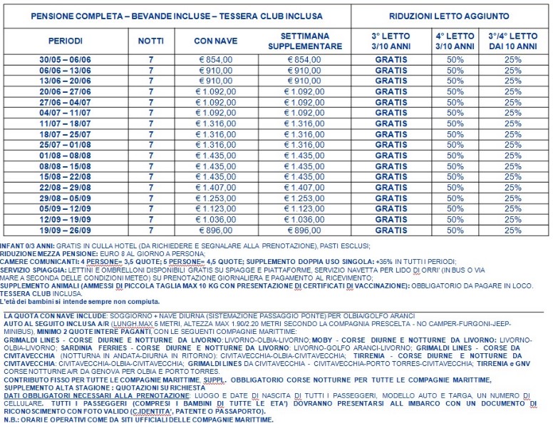 Le tariffe non comprendono eventuali promozioni da verificare al momento della prenotazione. Le tariffe riportate potrebbero non comprendere polizze assicurative integrative, adeguamento carburante (ove i trasferimenti fossero inclusi), eventuali tessere iscrizione, tasse, pulizie, consumi, ecc.; in tal senso è possibile richiedere accesso a listino dettagliato via mail, scrivendo a: numerouno@
