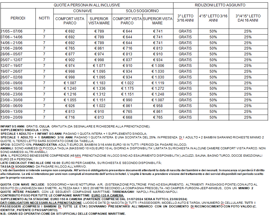 PARCHEGGIO interno recintato non custodito. FBB SPECIAL (pensione completa) e HBB (mezza pensione): dal 30 marzo al 26 maggio e dal 22 settembre al 19 ottobre si può prenotare in pensione completa e mezza pensione con bevande incluse a pranzo (light lunch presso uno dei bar vista mare con carta snack e servizio al tavolo o, a discrezione della Direzione, in sala ristorante con servizio a buffet) e/o a cena e serata tipica una volta a settimana, welcome drink, servizio di facchinaggio, reception H24, internet point nella hall, Wi-fi nella hall e nelle zone comuni ,piscina olimpionica e piscine del Golfo con ombrelloni e lettini, piano bar, campi sportivi diurni, Toboggan e Lido Pontone, utilizzo diurno della palestra, Nello land, parcheggio interno non custodito. Nei periodi di bassa stagione a discrezione della Direzione, il servizio buffet potrebbe essere sostituito dal servizio a tavolo con menù di 3 portate, alcuni servizi potrebbero non essere disponibili durante la domenica.