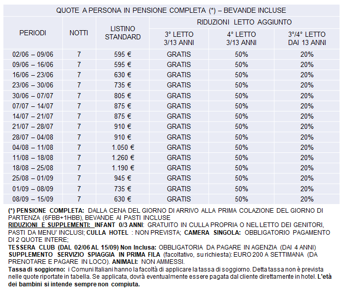 TESSERA CLUB: obbligatoria a partire dai 4 anni, da regolare in loco all’arrivo, include servizio spiaggia dalla 2° fila in poi (1° fila a pagamento in loco, secondo disponibilità)