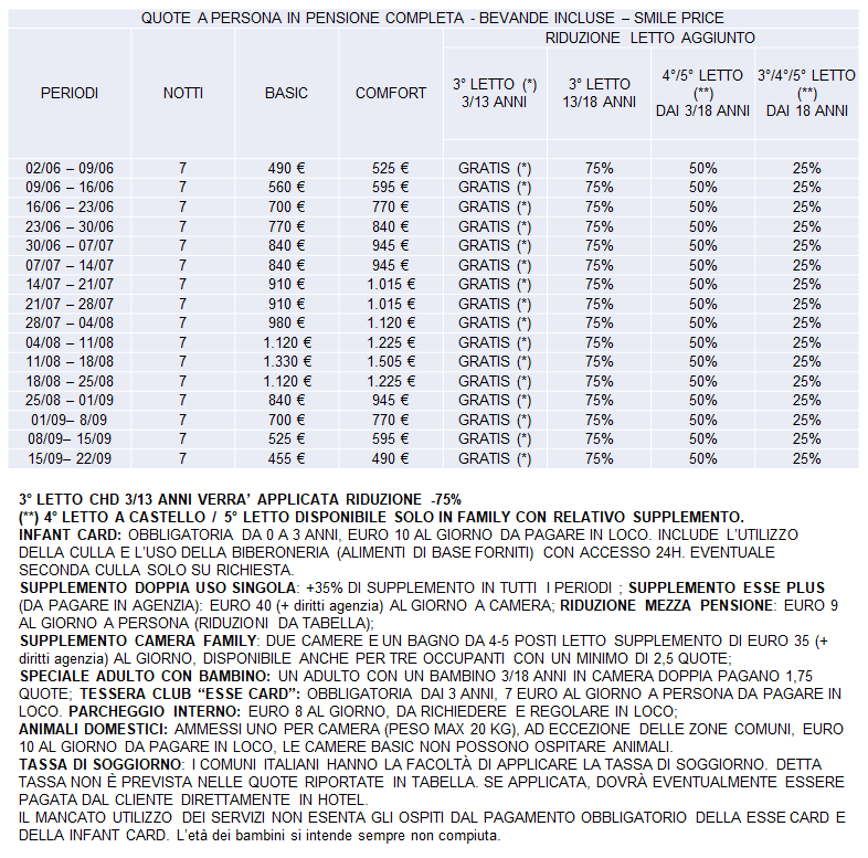 Tessera Club “Esse Card”: obbligatoria dai 3 anni, da pagare in loco. Include: accesso alla piscina e alla spiaggia attrezzata (dalla terza fila, prime due file a pagamento), le attività Hero Camp e Young Club, utilizzo delle installazioni sportive e ricreative, fitness, acquagym, balli di gruppo, giochi e tornei, music bar, spettacoli serali. Infant Card: Obbligatoria da 0 a 3 anni, da pagare in loco. Include l’utilizzo della culla e l’uso della biberoneria (alimenti di base forniti) con accesso 24h. Eventuale seconda culla solo su richiesta.