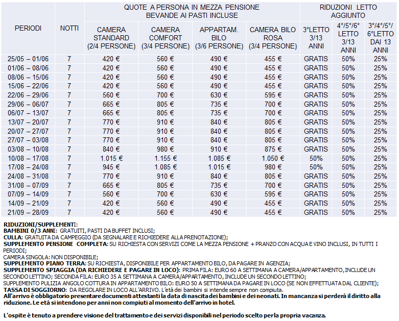 Soggiorni: Sabato/Sabato (minimo 7 notti dal 22/06 al 14/09), nei restanti periodi minimo 3 notti. Le camere vengono consegnate a partire dalle ore 17.00 del giorno di arrivo e devono essere rilasciate entro le ore 10.00 del giorno di partenza.
