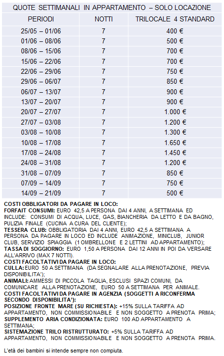 SISTEMAZIONE: Gli appartamenti Trilocali 4 posti letto, alcuni recentemente ristrutturati (con supplemento), sono situati in un’oasi verde di piante, alberi e fiori, direttamente sul mare. Gli appartamenti sono distribuiti in palazzine a schiera, alcuni con fronte mare (con supplemento). Gli appartamenti sono con giardino se al piano terra oppure al primo piano con terrazzino. Offrono i seguenti comforts: soggiorno con divano e televisione, cucina arredata, una camera da letto matrimoniale, una camera con letto singolo, un bagno con doccia. Su richiesta possibilità di 5° letto aggiunto in cucina/soggiorno.