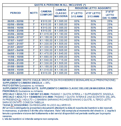 SERVIZI NON INCLUSI: PACCHETTO GOLD, SPA: il piccolo e suggestivo Centro Benessere, situato all’interno della Masseria, è completo di piscina che si inoltra all’esterno nel cortile dell’antica Masseria, solarium, bagno turco, docce emozionali, tisaneria e cabine massaggi. MINIBAR in camera. PIC NIC EXPERIENCE (tutti i martedì e giovedì su prenotazione fino ad esaurimento) comprende: un cestino pic nic con bottiglia di vino locale, acqua, spremuta o estratto di frutta fresca di stagione, prodotti 100% Made in Puglia e degustazione di marmellatine da consumare su morbidi cuscinoni sotto gli alberi in un’atmosfera romantica dove rivivere un ritorno all’infanzia a stretto contatto con la natura. CAMPI SPORTIVI utilizzo notturno. CAMPO DA PADEL. TASSA DI SOGGIORNO da pagare in loco. STORE. TRANSFER ED ESCURSIONI: da prenotare in corner dedicato. NOLEGGIO auto, bici non professionali, passeggini e vaschette da bagno per i bambini. LAVANDERIA. 2 COLONNINE PER RICARICA ELETTRICA. AMBULATORIO MEDICO: medico generico su chiamata