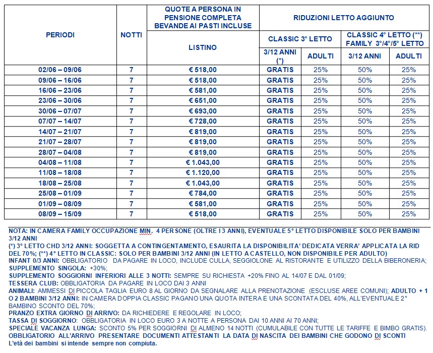 Le tariffe non comprendono eventuali promozioni da verificare al momento della prenotazione. Le tariffe riportate potrebbero non comprendere polizze assicurative integrative, adeguamento carburante (ove i trasferimenti fossero inclusi), eventuali tessere iscrizione, tasse, pulizie, consumi, ecc.; in tal senso è possibile richiedere accesso a listino dettagliato via mail, scrivendo a: numerouno@