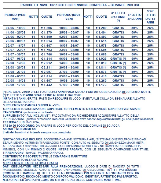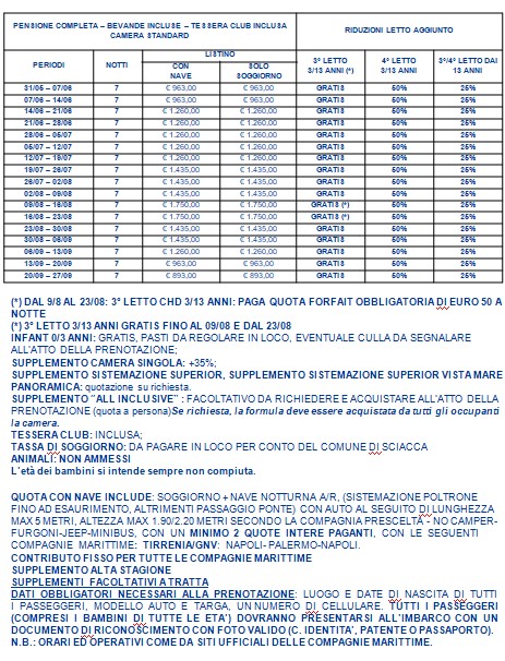 ADULTI: EURO 25 AL GIORNO A PERSONA // BAMBINI-ADOLESCENTI 3/18 ANNI N.C.: EURO 70 AL GIORNO A PERSONA