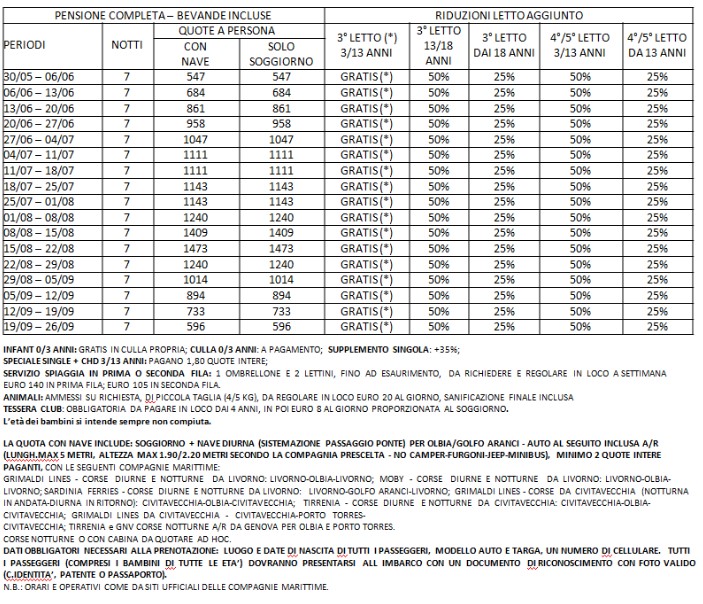 Le tariffe non comprendono eventuali promozioni da verificare al momento della prenotazione. Le tariffe riportate potrebbero non comprendere polizze assicurative integrative, adeguamento carburante (ove i trasferimenti fossero inclusi), eventuali tessere iscrizione, tasse, pulizie, consumi, ecc.; in tal senso è possibile richiedere accesso a listino dettagliato via mail, scrivendo a: numerouno@