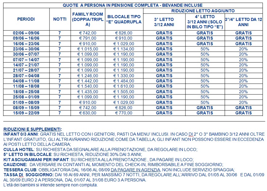 Le tariffe non comprendono eventuali promozioni da verificare al momento della prenotazione. Le tariffe riportate potrebbero non comprendere polizze assicurative integrative, adeguamento carburante (ove i trasferimenti fossero inclusi), eventuali tessere iscrizione, tasse, pulizie, consumi, ecc.; in tal senso è possibile richiedere accesso a listino dettagliato via mail, scrivendo a: numerouno@