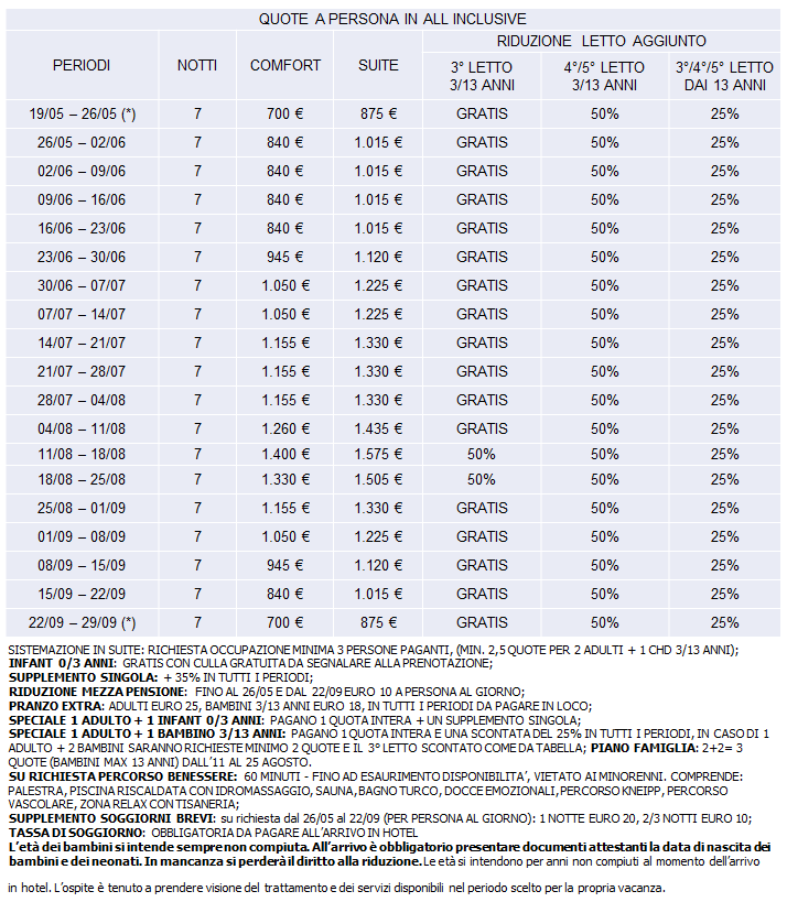 Le tariffe non comprendono eventuali promozioni da verificare al momento della prenotazione. Le tariffe riportate potrebbero non comprendere polizze assicurative integrative, adeguamento carburante (ove i trasferimenti fossero inclusi), eventuali tessere iscrizione, tasse, pulizie, consumi, ecc.; in tal senso è possibile richiedere accesso a listino dettagliato via mail, scrivendo a: numerouno@