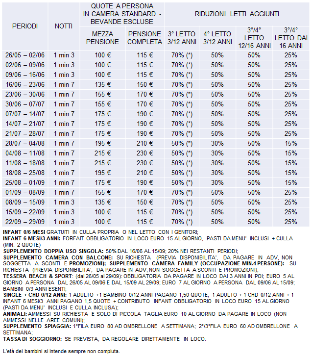 TESSERA BEACH & SPORT: La tessera valida dal 26/05 al 29/09 include: in spiaggia 1 ombrellone + 2 lettini dalla 4° fila in poi a camera; utilizzo piscina attrezzata con ombrelloni e lettini ad esaurimento. Dal 09/06 al 15/09 animazione diurna e serale, Mini Club dai 3 agli 11 anni, Junior Club dai 12 ai 17 anni. Piano bar serale.